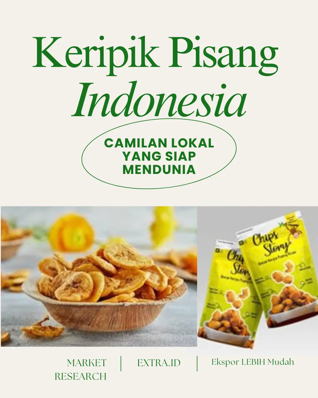 Indonesia memiliki keunggulan sebagai salah satu penghasil pisang terbesar di dunia, sehingga pasokan bahan baku sangat melimpah dan berkelanjutan. Ditambah dengan inovasi pengolahan, kemasan modern, serta sertifikasi keamanan pangan, keripik pisang Indonesia mampu bersaing dengan produk camilan global lainnya. Peluang ekspor terbuka lebar ke negara-negara seperti Malaysia, Singapura, Jepang, Timur Tengah, Amerika, dan Eropa, terutama melalui jalur retail Asia food, marketplace global, dan private label.